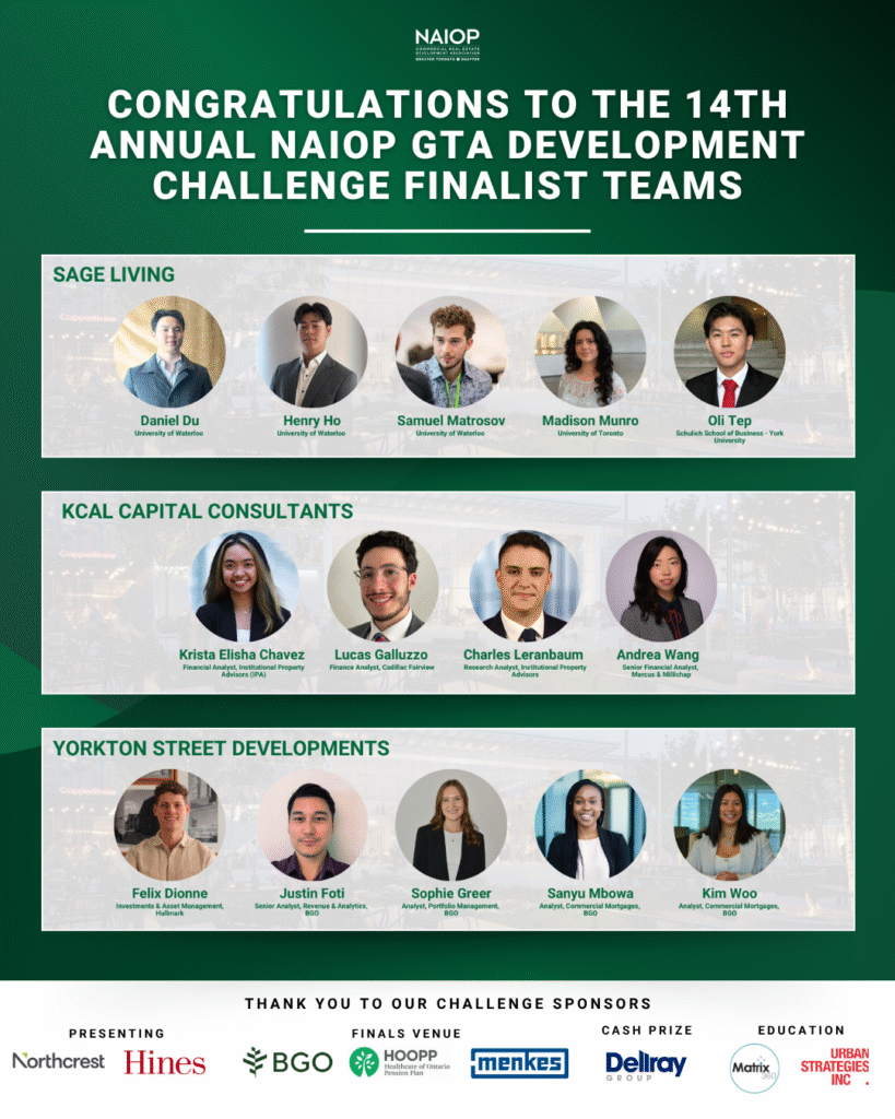 This marquee NAIOP GTA event included a Live Finals Event, where three finalist teams presented live to a panel of judges with colleagues and mentors in attendance, for a chance to win cash prizes for first, second and third-place team placements!